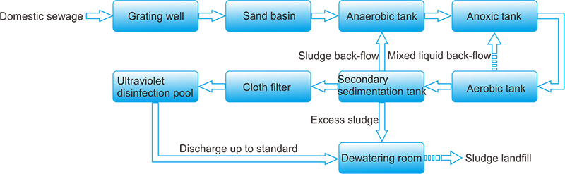 The process flow chart of "grating + sand basin + modified A2/O + secondary sedimentation tank + cloth filter + ultraviolet disinfection" is as follows: