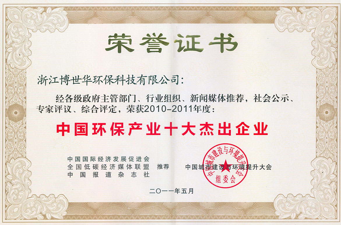 經各級政府主管部門(mén)、行(háng)業組織、新聞媒體推薦,社會(huì)公示、專家評議(yì)、綜合評定,公(gōng)司榮獲2010-2011年度“中國環保(bǎo)產業十大傑出企業”