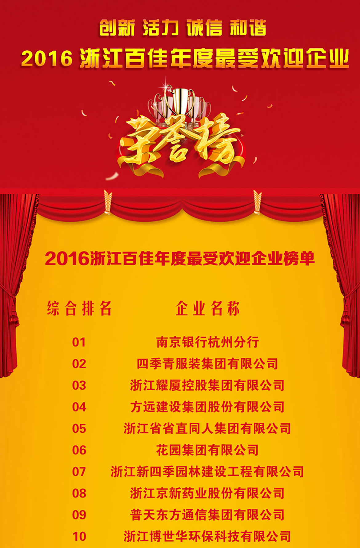 為推(tuī)動浙江省(shěng)企業的誠信(xìn)和(hé)諧經營(yíng),增添企業的創新發展活力和動力,由浙江經濟網、新華網浙江頻道主辦,由中共浙(zhè)江省委政法委(wěi)員會、浙江(jiāng)省(shěng)人(rén)大內務司法委員會、浙(zhè)江省人民檢察院、浙江省科學技術(shù)廳、浙江省公安廳、浙(zhè)江省環境保護廳、浙江省住房和城鄉建設廳、浙江省國家稅務(wù)局、浙江省(shěng)政協經濟委員會(huì)、浙江省總工會、新華網等單位指導,於2016年12月聯合舉辦的“2016浙江百佳年度(dù)最受歡迎企業” 榮譽榜推選活(huó)動日前揭曉,我公司在眾多參評企業中脫穎(yǐng)而出,取(qǔ)得了第十名的(de)佳績。