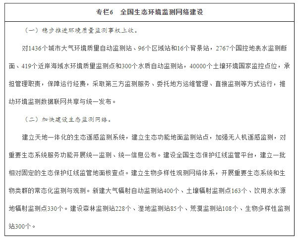 加強生態環境(jìng)監測網絡建設。統一規劃、優(yōu)化環境質量監測點位(wèi),建設(shè)涵(hán)蓋大(dà)氣、水、土壤、噪聲、輻射等要素,布局合理、功能完善的全國(guó)環境質量監測(cè)網絡,實現生態(tài)環境監測信息集成共享。大氣、地表水環境質量監測點位總體覆蓋80%左右(yòu)的區縣,人口密集的區縣實現全覆蓋,土壤環境質量監測點位實現全覆蓋(gài)。提高大氣環境質量預報和汙染預警水平,強化汙染源(yuán)追蹤與解析,地級及以上城市開(kāi)展大氣(qì)環境質量預報。建(jiàn)設國家水質監(jiān)測預警平台。加強(qiáng)飲用水水源(yuán)和土壤中持久性、生物富集性以及對人體健(jiàn)康(kāng)危害大的汙染物監(jiān)測。加強重點流(liú)域城鎮集中式飲用(yòng)水水源水質、水體放(fàng)射性(xìng)監測和預警。建立天地一體化的生態遙(yáo)感監測係(xì)統,實現環境衛星組網運行,加強無人機遙感監測和地麵生態監測。構建生物多樣性觀測網絡。