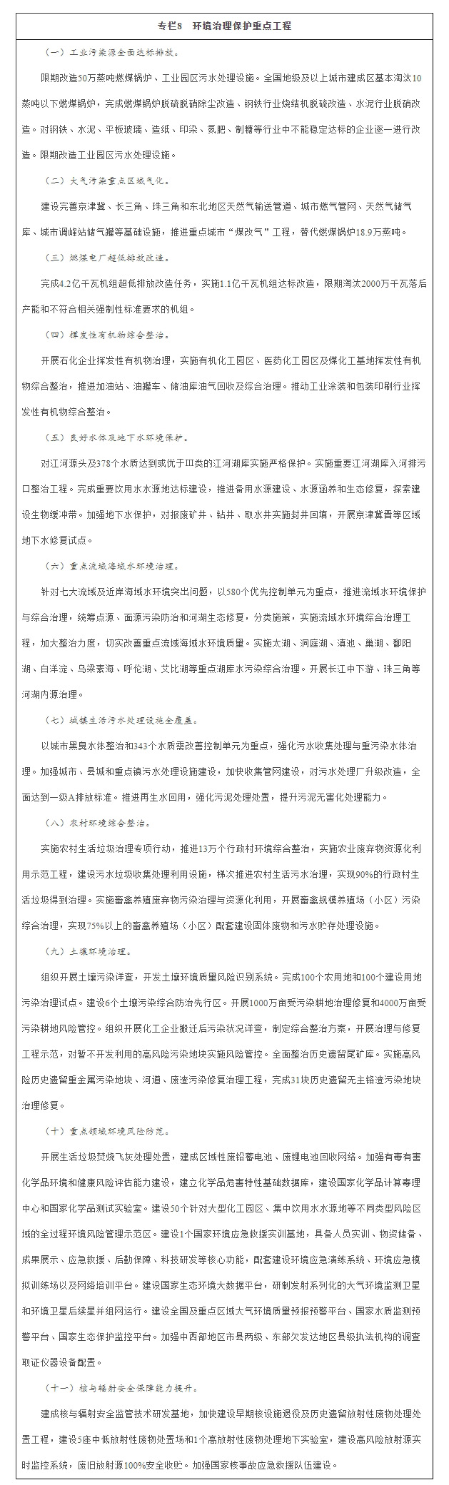 “十三五”期間,國(guó)家組織實施工業汙染源全麵達標排放等25項重點工程,建立重大項目庫,強化項目(mù)績效管(guǎn)理。項目投入以企業和地方(fāng)政府為主,中央財政予以適當支持。