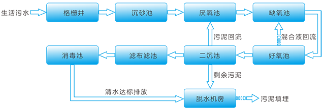 “格柵+沉砂池+改良型A2/O+二沉池+濾布濾池+紫外線消毒”工藝:進水中漂浮物及粗大(dà)顆粒物被格柵攔截,然後進入沉砂池,去除其中砂粒,防止其在後續(xù)構築物中沉積(jī),出水進入整個汙水處理部分的核心部分改(gǎi)良型A2/O係統,汙水從(cóng)厭氧(yǎng)池進入生化處理係統(tǒng),依次流經厭氧池、缺氧池、好氧池,同時混合液回流至缺氧池,出水排至二沉池,泥水分離,汙(wū)泥(ní)回流至生化係統,汙水進入濾布濾池,過濾後出水進入(rù)紫外線消毒池,達標後排(pái)放。